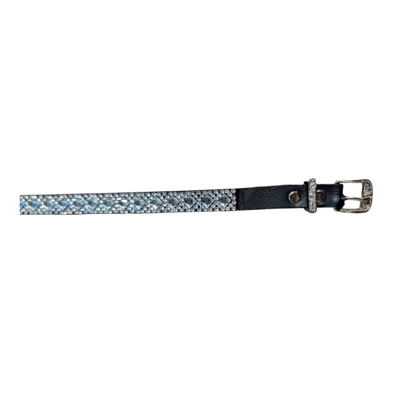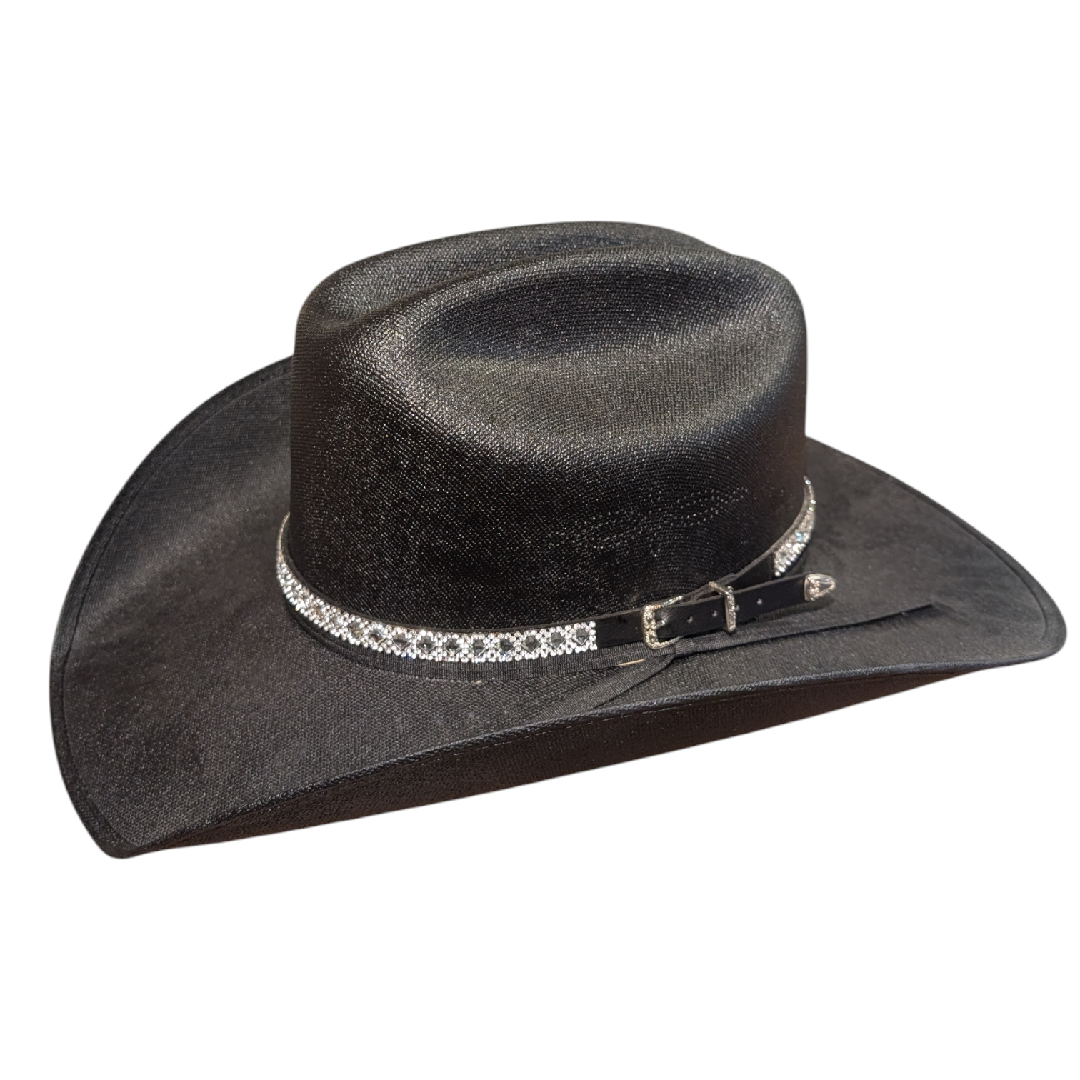 Elevate your cowboy hat with this striking western hat band, designed to add personality and sparkle to any look. Made with a durable black leather base, featuring a decorative western-style buckle and keeper for an adjustable, secure fit.