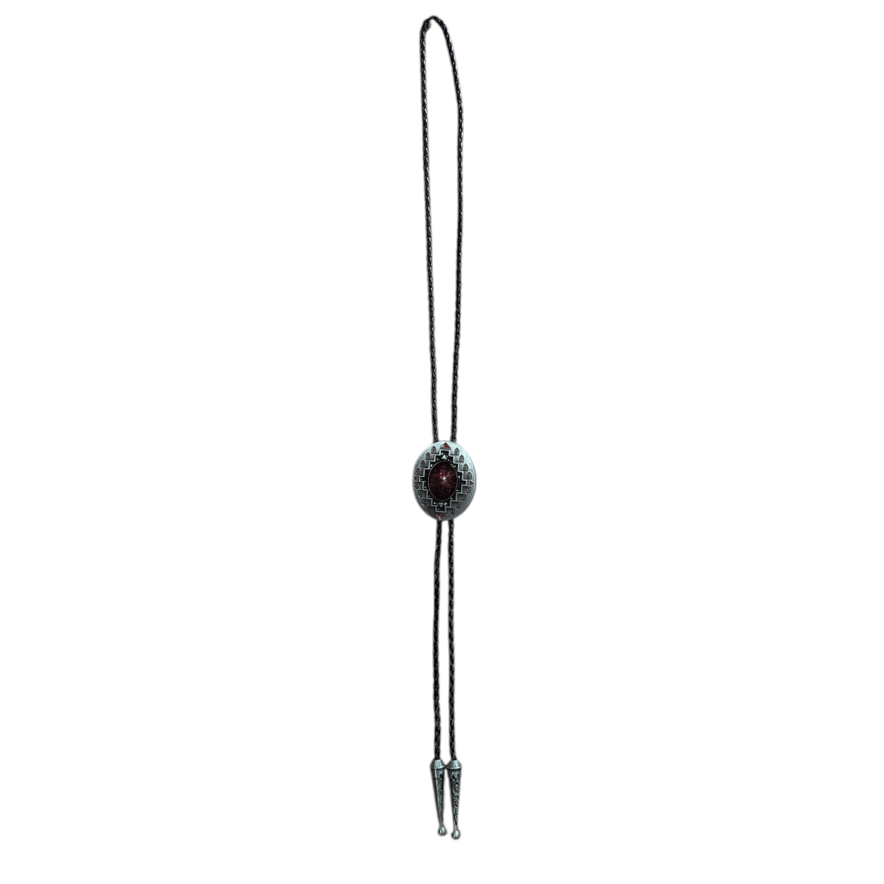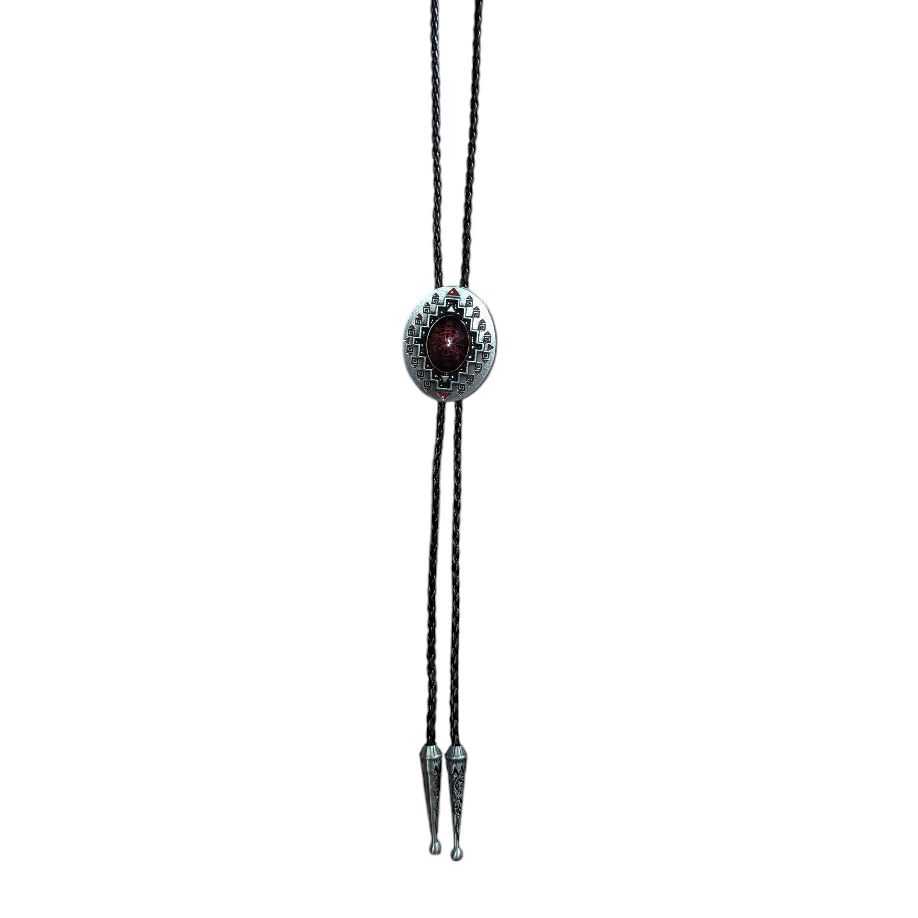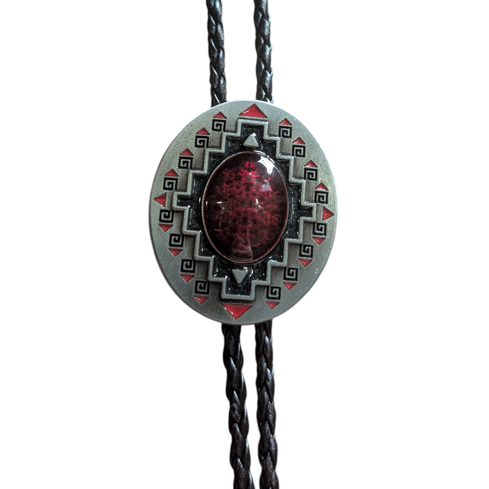 Western Bolo Tie (0042) - Silver Geometric Print w/ Red Centre Stone