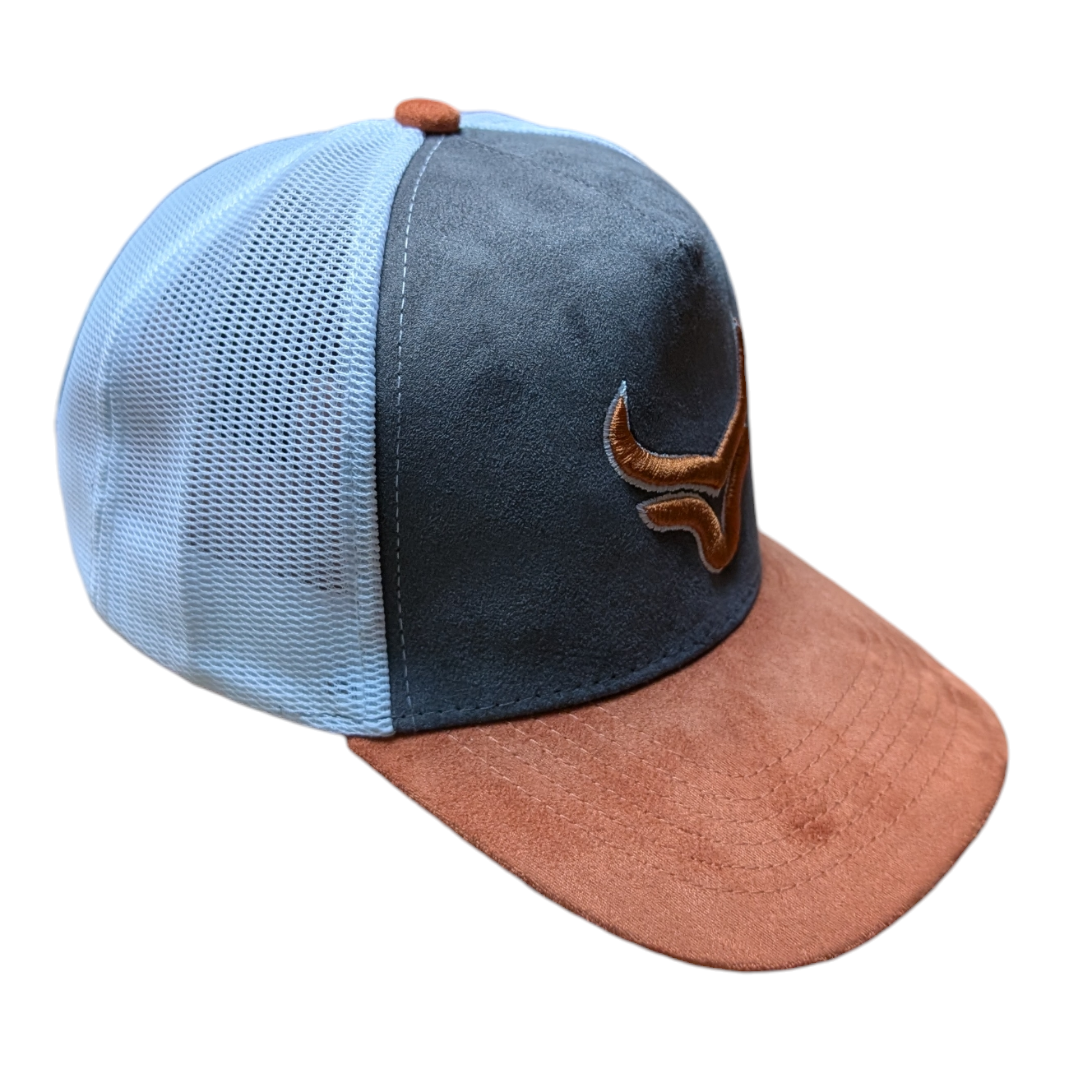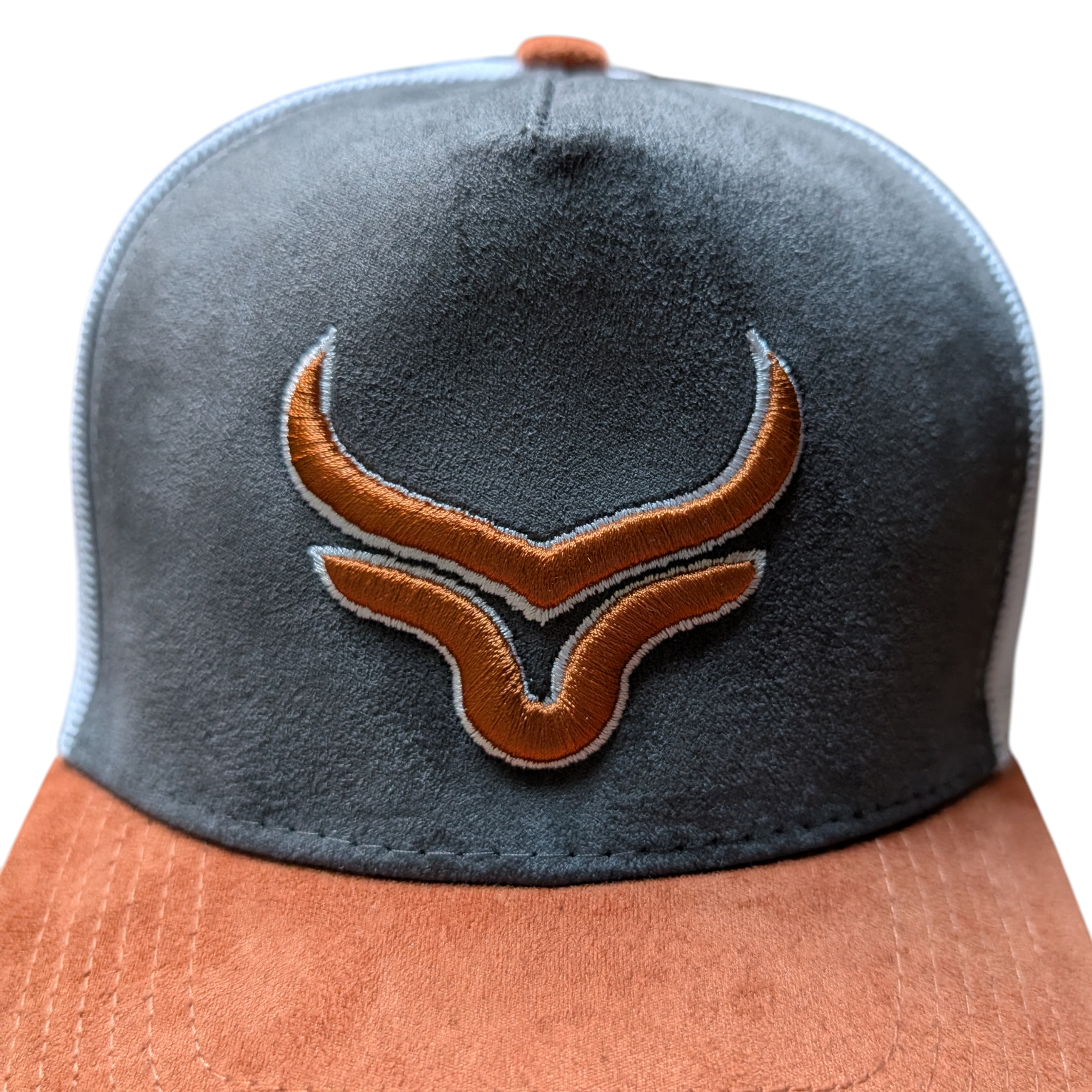 Western Cap (0004) - Grey and Burnt Orange w/ White Mesh & Longhorn Stitching