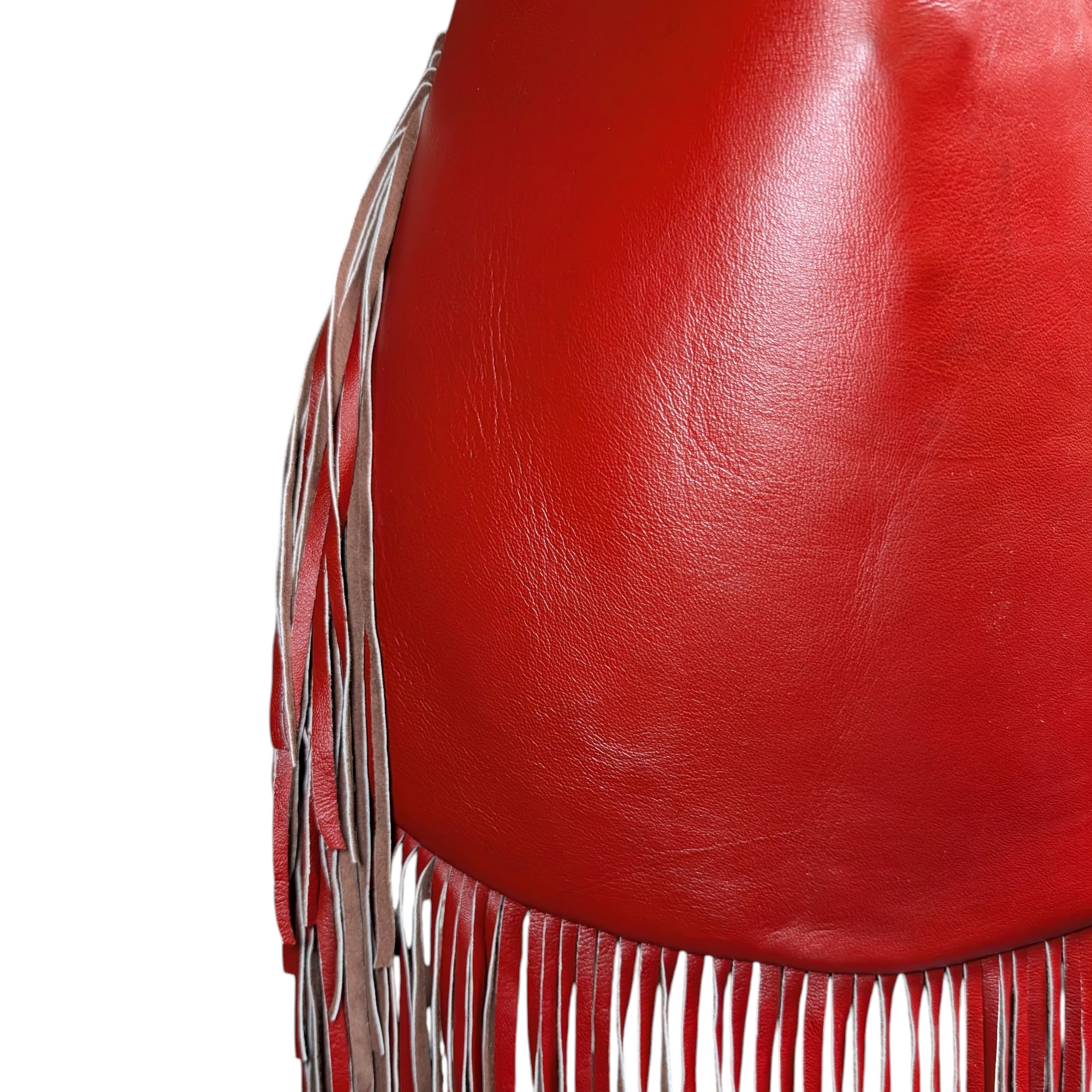 The long, flowing fringe adds movement and a bold statement, while sturdy hand-stitching ensures durability for everyday wear. The spacious interior is perfect for carrying your essentials, and a leather strap allows for shoulder wear.