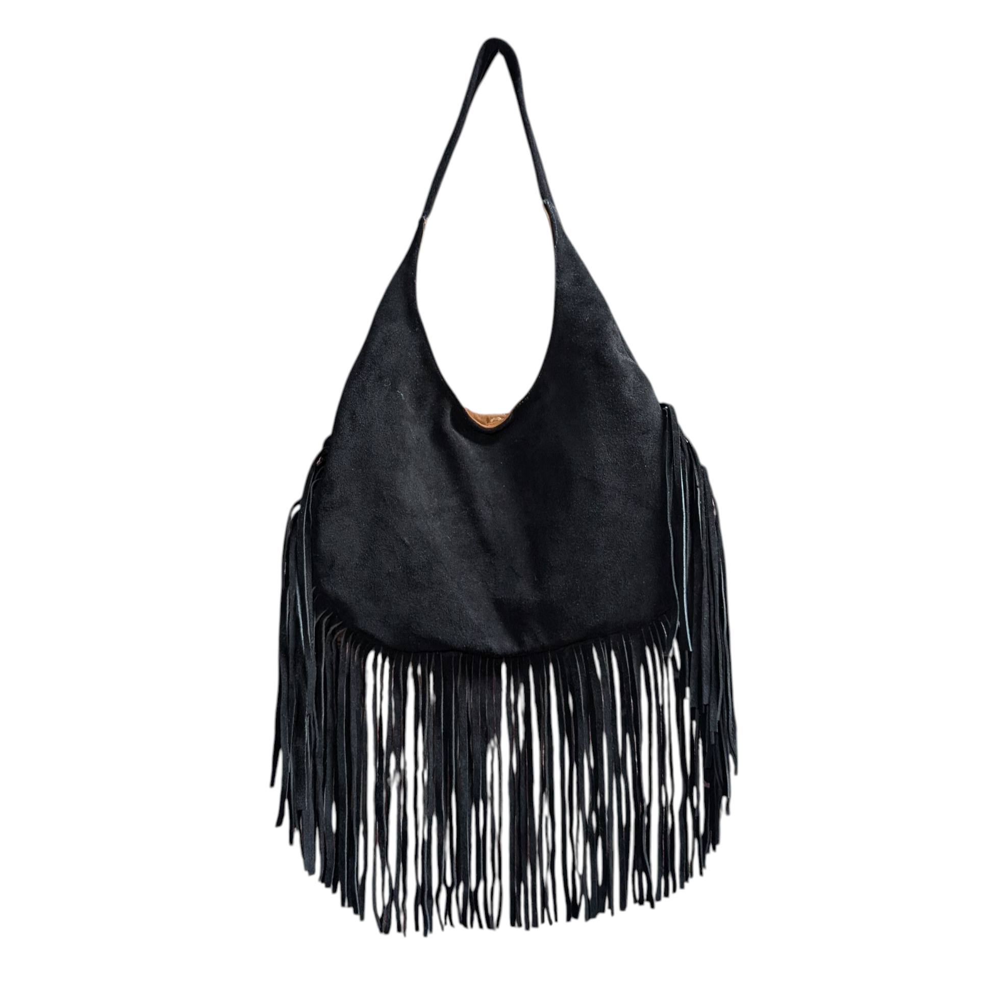 The long, flowing fringe adds movement and a bold statement, while sturdy hand-stitching ensures durability for everyday wear. The spacious interior is perfect for carrying your essentials, and a leather strap allows for shoulder wear.