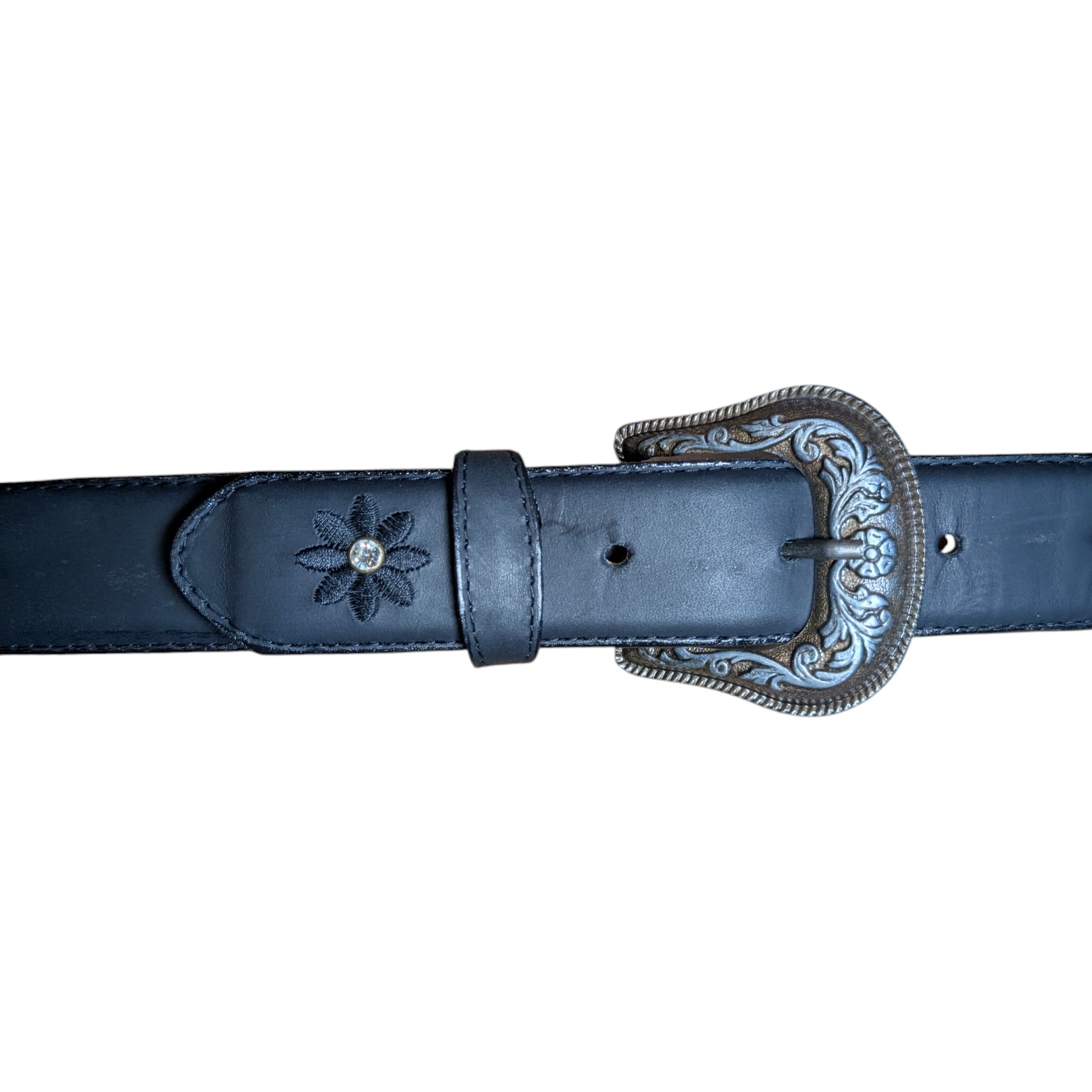 Western Leather Belt (0019) - Matte Black Floral Stitching w/ Engraved Buckle