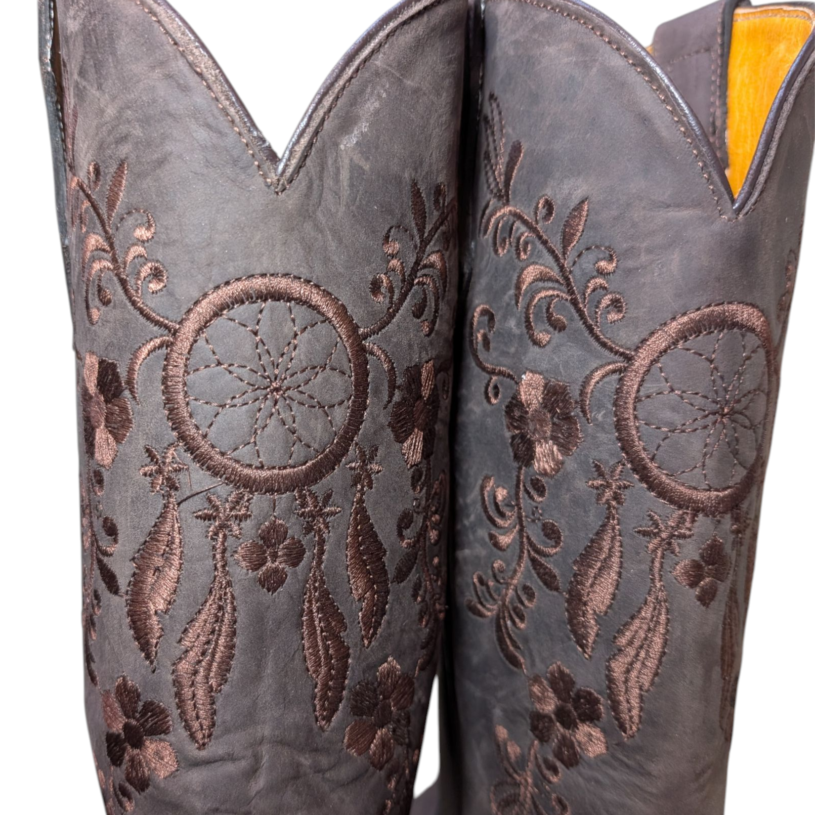 Rustic brown cowboy boots made with 100% genuine leather. These are a production of boots we made with a wider shaft to fit a wider calf more comfortably. Featuring embroidered detailing - available in two different styles. Sole hand-stitched leather.