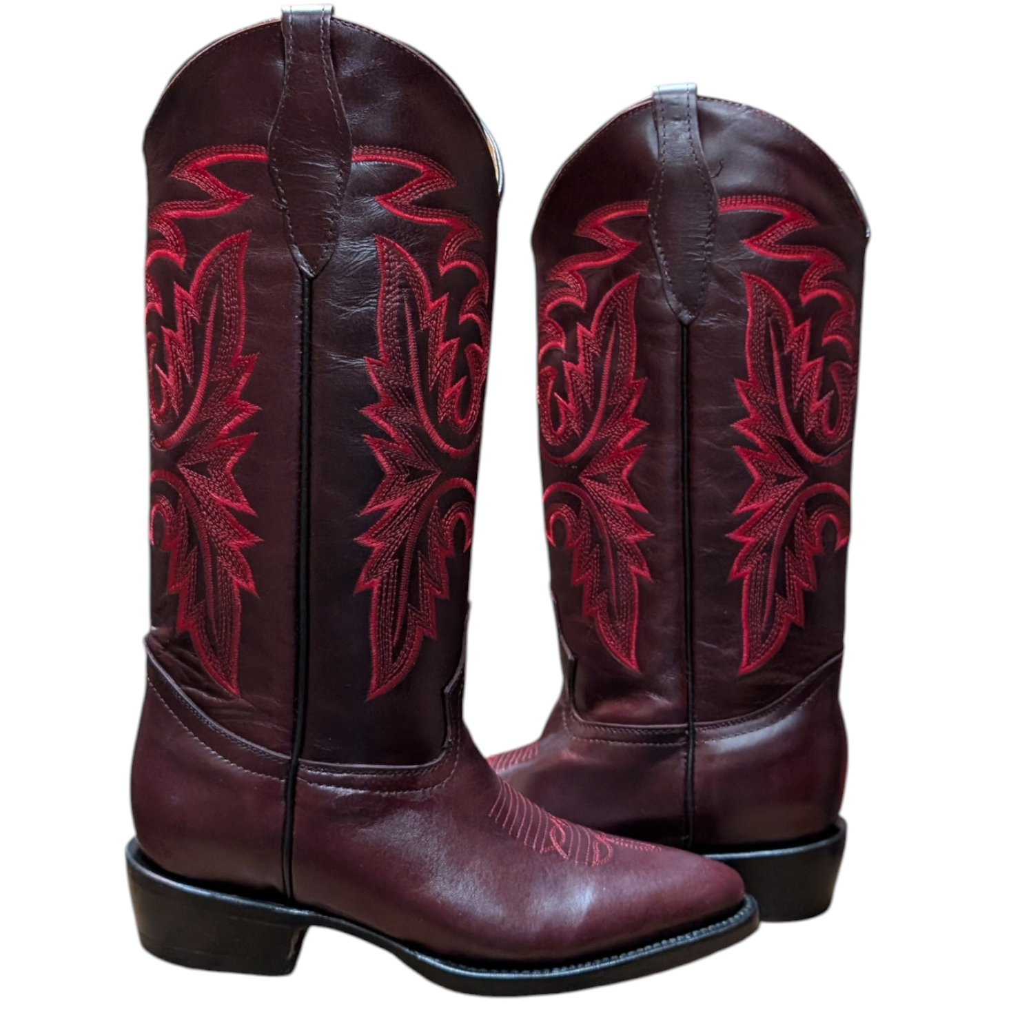 Burgundy cowboy boots made with 100% genuine leather. Featuring pink embroidered western detailing. Sole hand-stitched.